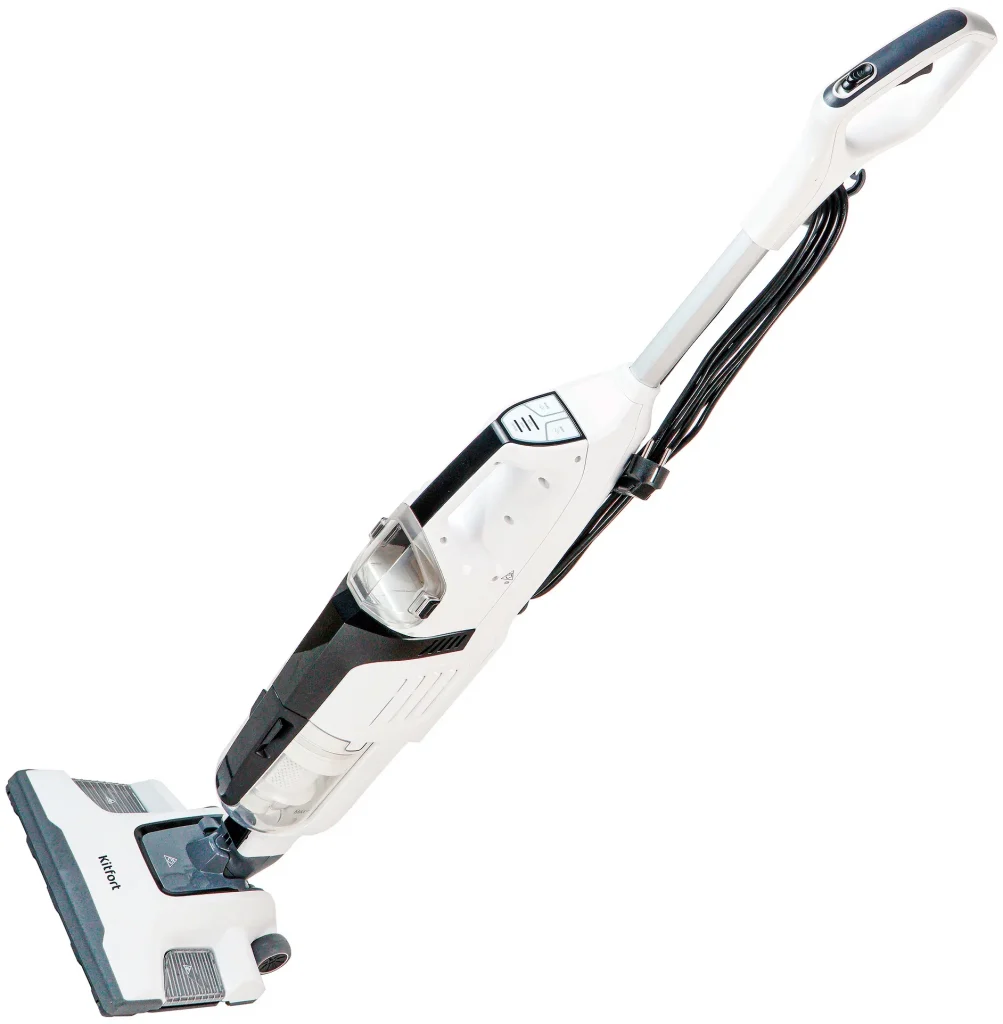 На первое место рейтинга пылесосов, питающихся от сети, мы поставили вертикальный пылесос KT-556 бренда Kitfort. Эта модель для тщательной сухой и влажной уборки дома отличается встроенной функцией горячего пара. Поверхность пола он обрабатывает горячим воздухом одновременно с тем, как всасывает сор и пыль. Мощность устройства — 500 Вт.