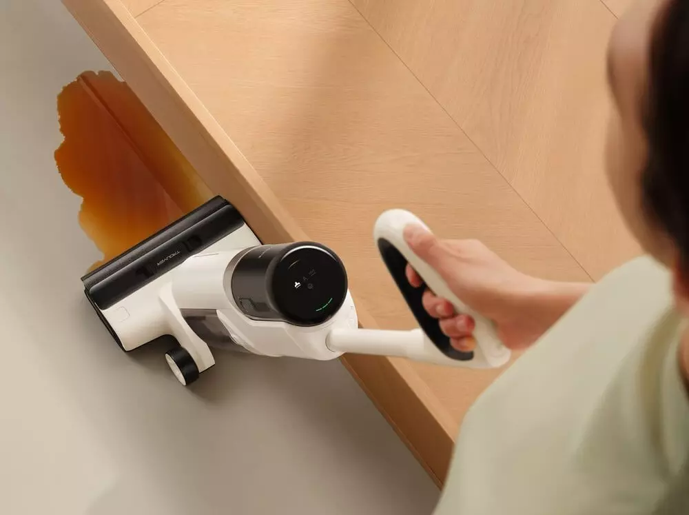 Пятое место занимает беспроводной моющий пылесос Dreame H13 Pro. Заявленная мощность — 18 000 Па, это очень хороший показатель. После мытья пол остаётся слегка влажным, без луж и разводов. Его вместительные резервуары (900 мл для чистой и 700 мл для грязной воды) позволяют обработать значительную площадь без перерывов на дозаправку.