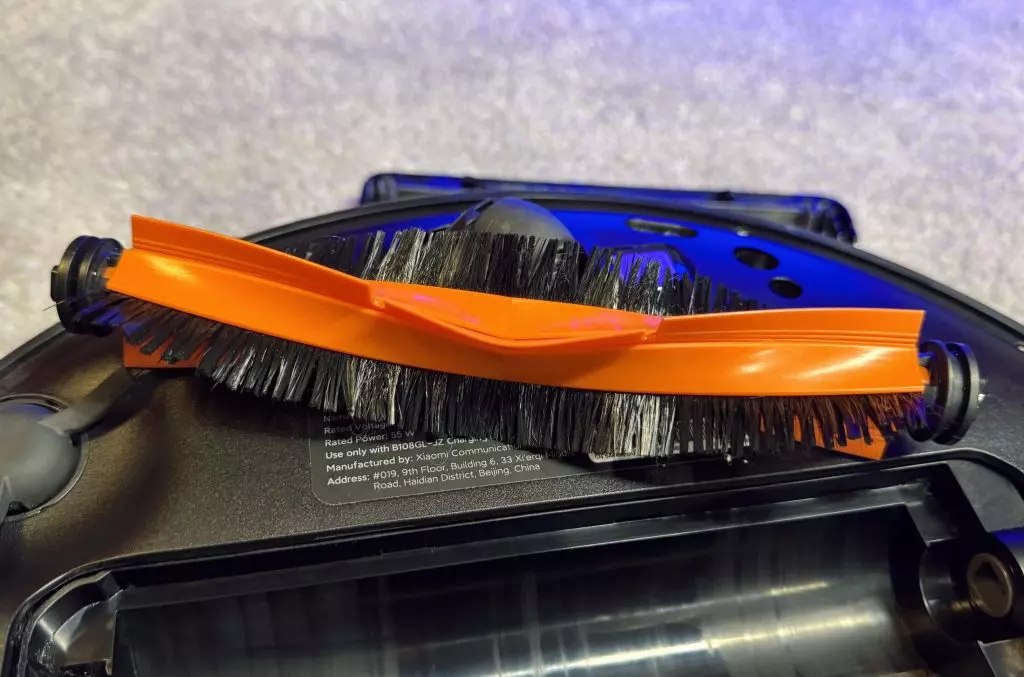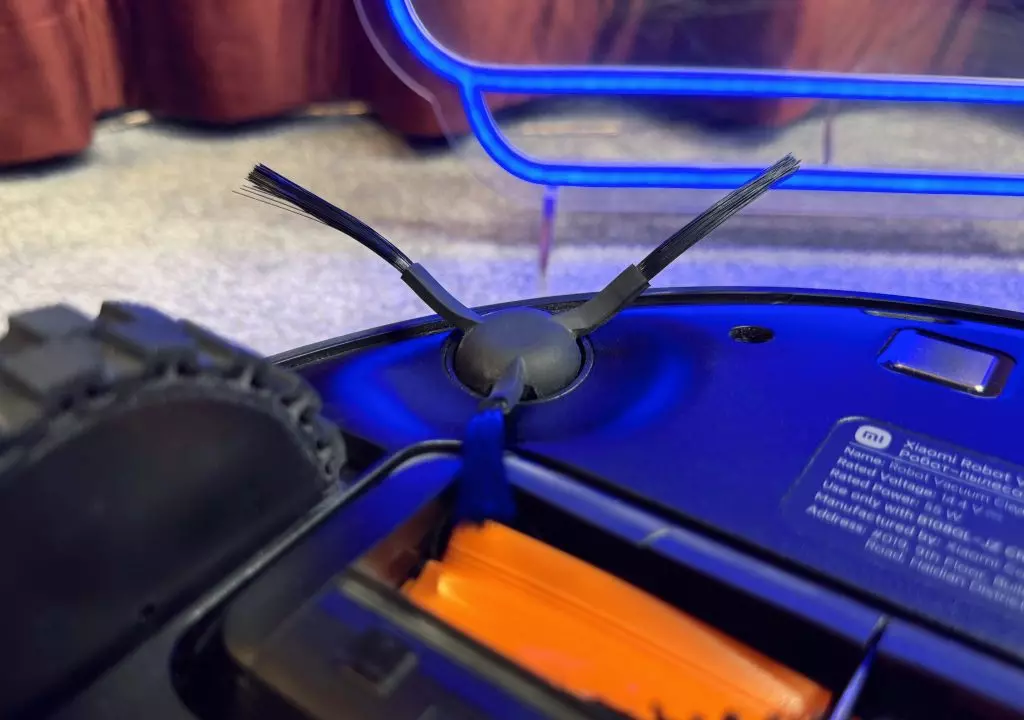 Боковая щётка надевается плавно, до щелчка. Она выступает за корпус на 5 см, но не полностью компенсирует округлую форму пылесоса при движении в углах и вдоль стен — небольшая полоса останется не почищенной. Это довольно распространённая проблема для подобных роботов.